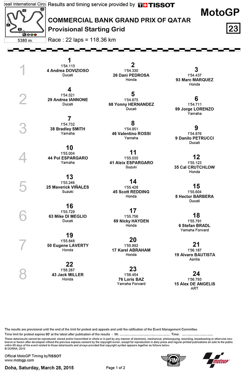Andrea Dovizioso (Ducati) a remporté la première pole position de la saison MotoGP 2015 au Grand Prix Commercial Bank du Qatar, démontrant de nouveau l’excellent potentiel de la nouvelle Desmosedici GP15, qui sera donc en tête de la grille pour sa première course.