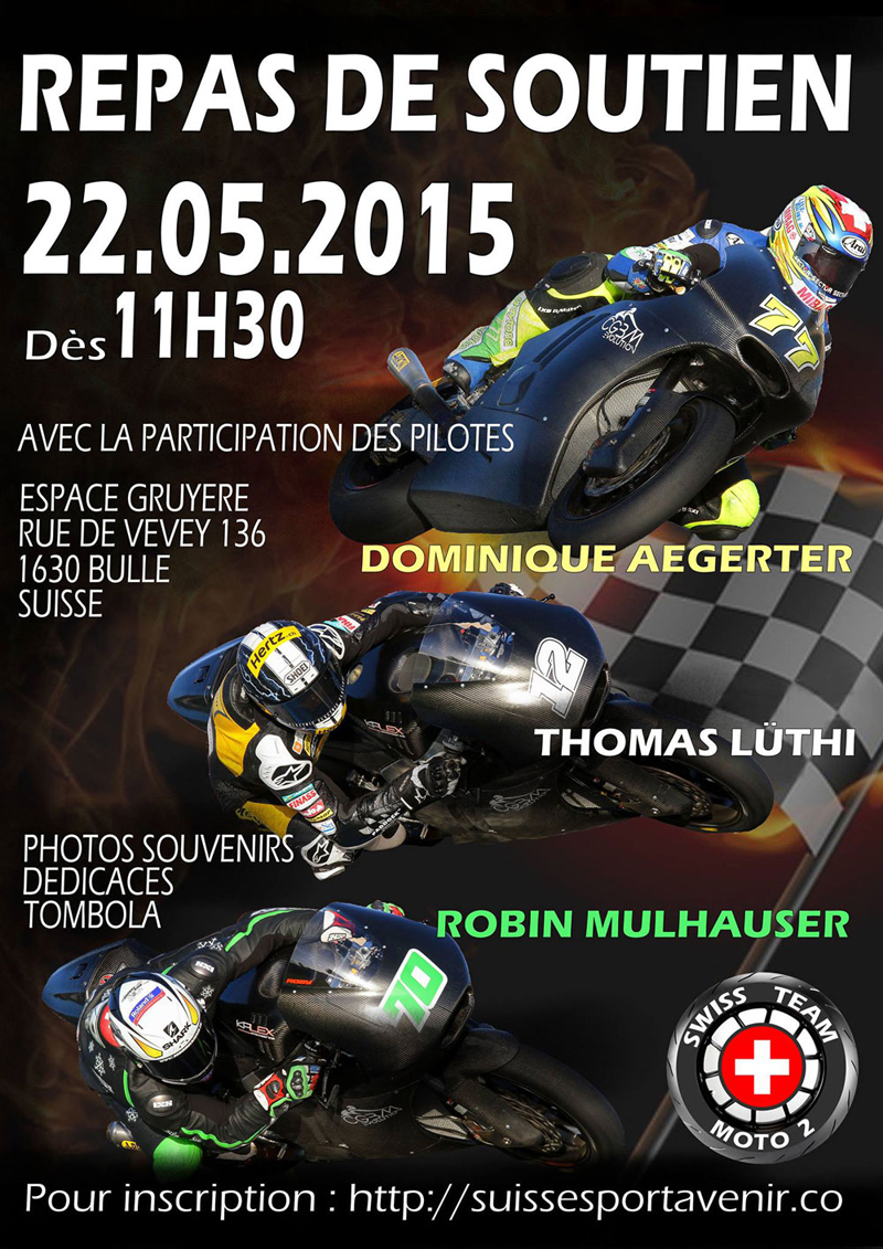 Les stars aussi ont besoin de soutien! Ainsi, le repas de soutien du Swiss Team Moto2 aura lieu le 22 mai à l’Espace Gruyère de Bulle.Les trois pilotes seront présents. Venez nombreux féliciter, encourager et faire la fête avec Thomas Lüthi, Dominique Aegerter et Robin Mulhauser.