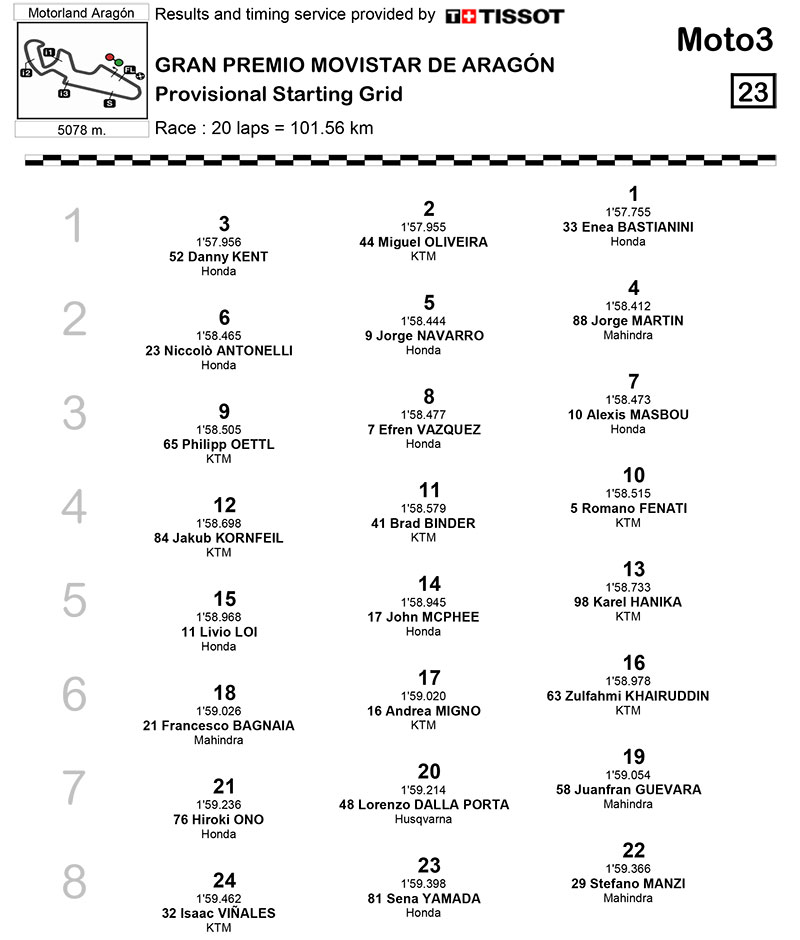Jorge Martín (Mapfre Team Mahindra) mènera la deuxième ligne devant son compatriote Jorge Navarro (Estrella Gaclia 0,0), qui est de retour en pleine forme après avoir manqué la course de Misano pour avoir été secoué dans une lourde chute. Les deux Espagnols retrouveront en deuxième ligne l’Italien Niccolò Antonelli (Ongetta-Rivacold), qui est monté sur le podium lors des deux dernières courses après avoir signé son premier Top 3, et surtout sa première victoire, en République Tchèque.