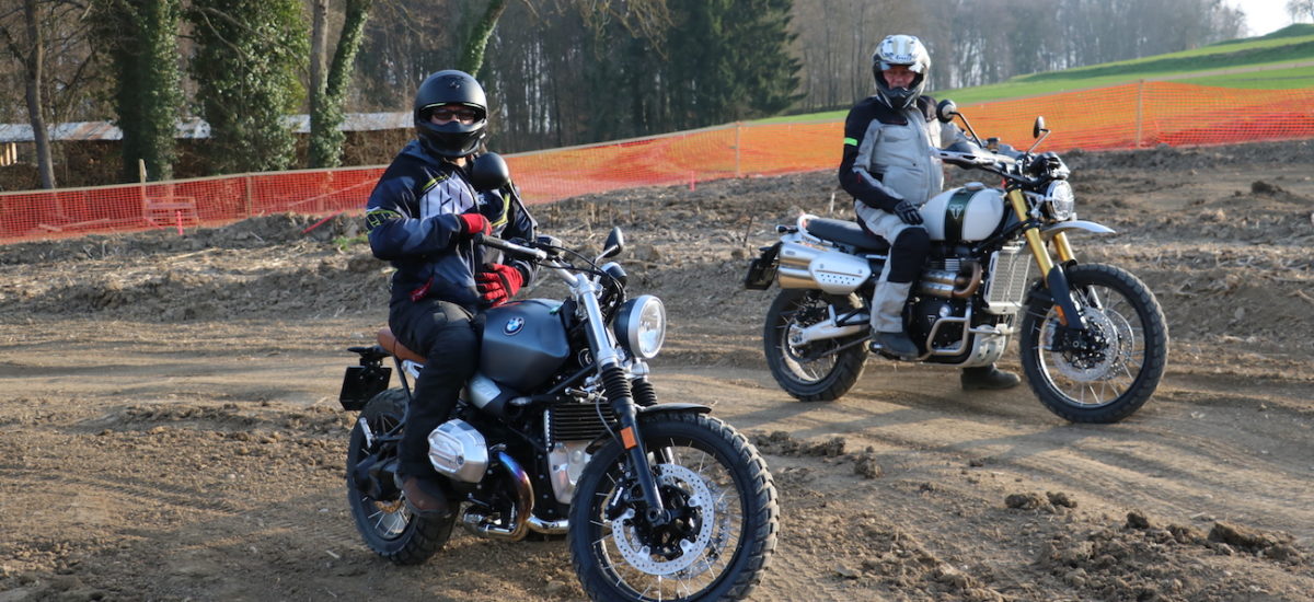 D’un côté le tout nouveau Triumph Scrambler 1200, prêté par Triumph Suisse. Et de l’autre une valeur sûre allemande, la BMW R NineT Scrambler. Toutes deux sont officiellement des scramblers, ce qui veut dire une machine de route transformée pour pouvoir se débrouiller en tout-terrain. L’appellation est historique et remonte aux années 50′-60′, à une époque où les motos de cross et d’enduro n’existaient pas encore vraiment pour le public.