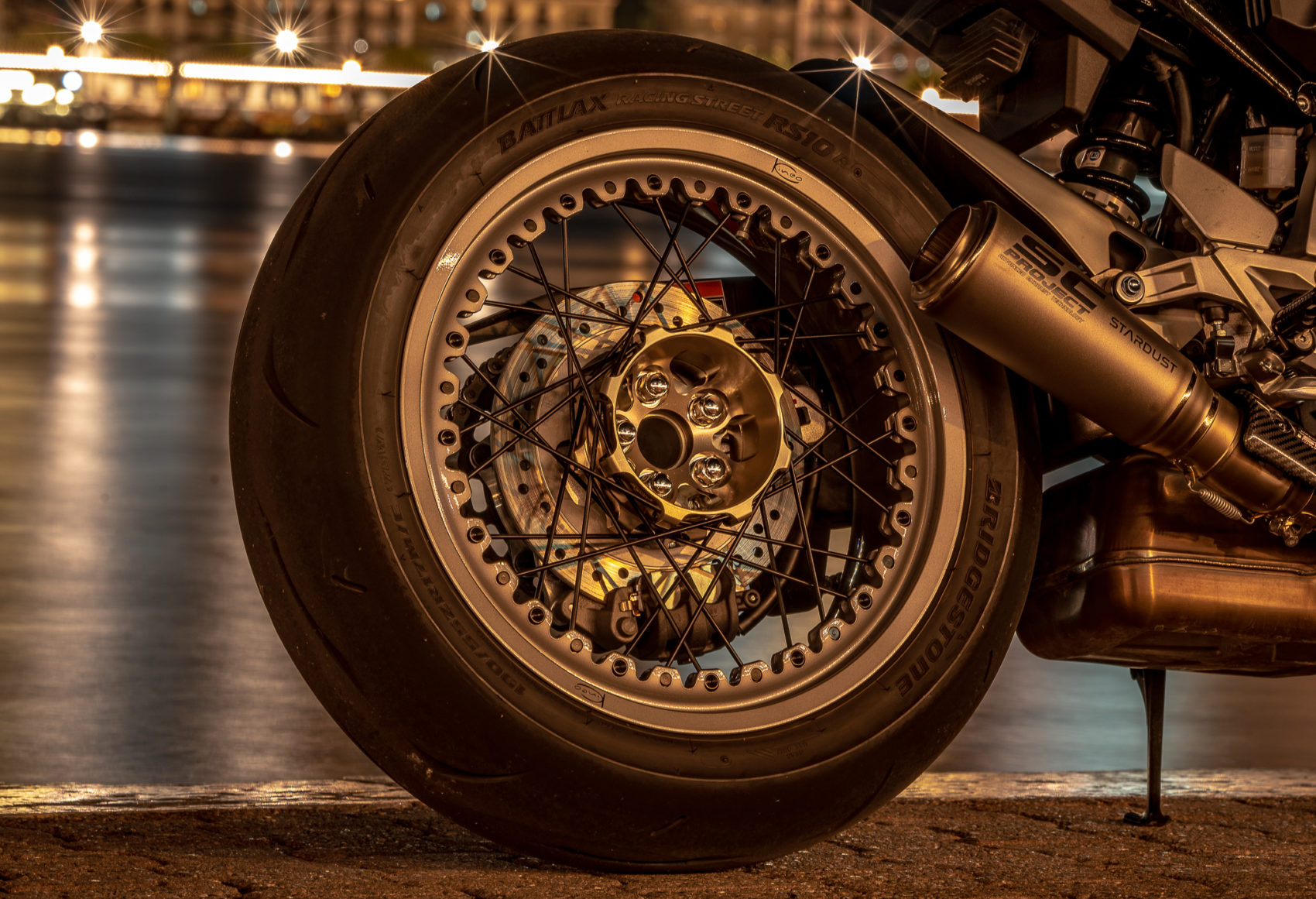Previous ImageNext Image Honda CB1000R Stardust ActuMoto © Mathias Deshusses-21 Le silencieux d’échappement SC Project, plus court que l’origine, permet de dégager entièrement la superbe jante à rayons Kinéo.