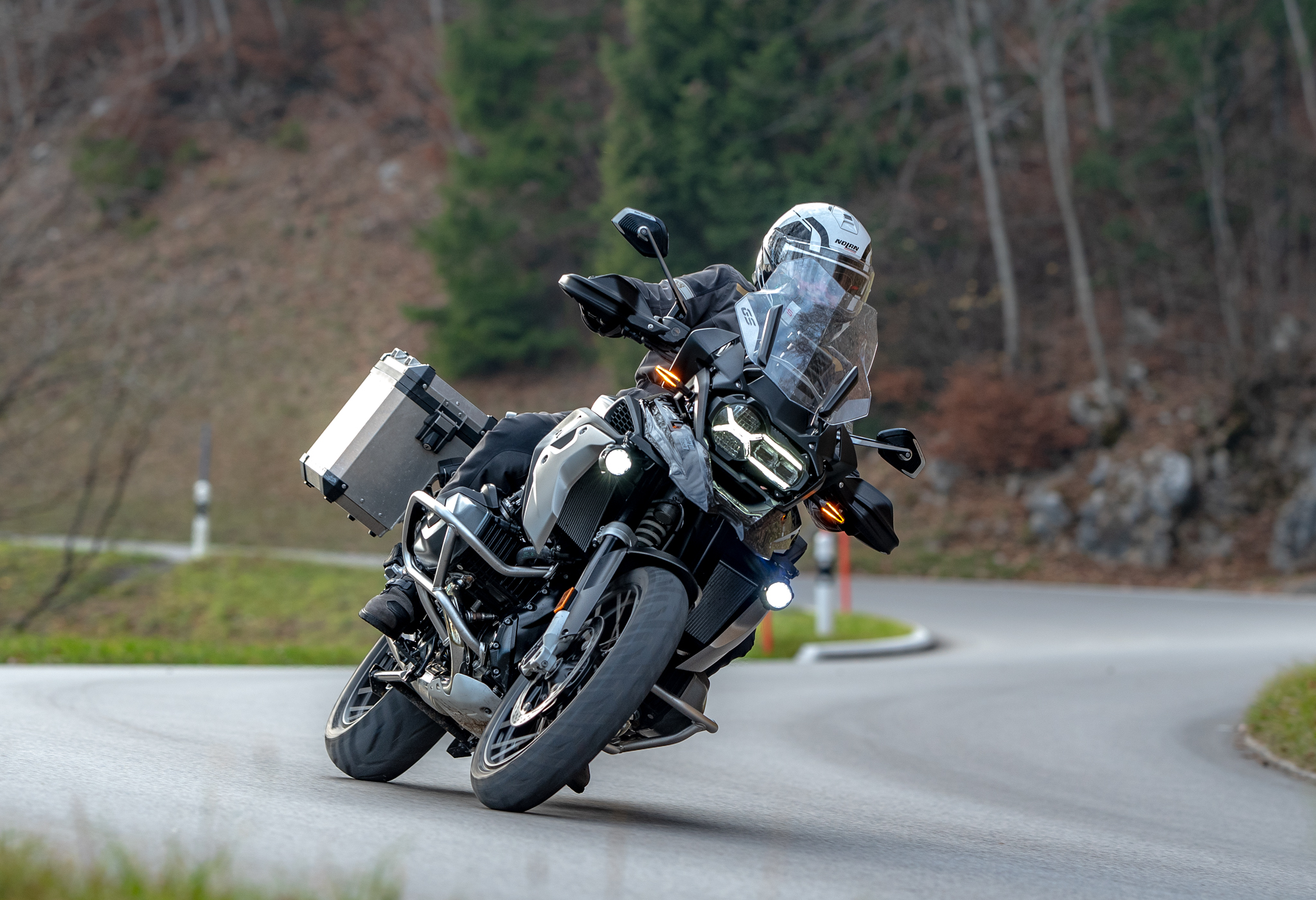 En partance pour deux jours en Suisse centrale, je prends l’autoroute sous une belle couche de brouillard. Le témoin de température peine à afficher un petit 5 degrés. La selle en position haute, je jouis d’une ergonomie parfaite. J’apprécie à nouveau le bon niveau de protection offert par la bulle, mais aussi le chauffage des poignées et de la selle, un vrai bonheur. Les suspensions toujours programmées sur Road, je constate un léger flou du train arrière dans la zone des 120 km/h. Je passe sur Dynamic et cette sensation disparaît. L’aérodynamisme des larges valises latérales n’est certainement pas étranger à ce phénomène.