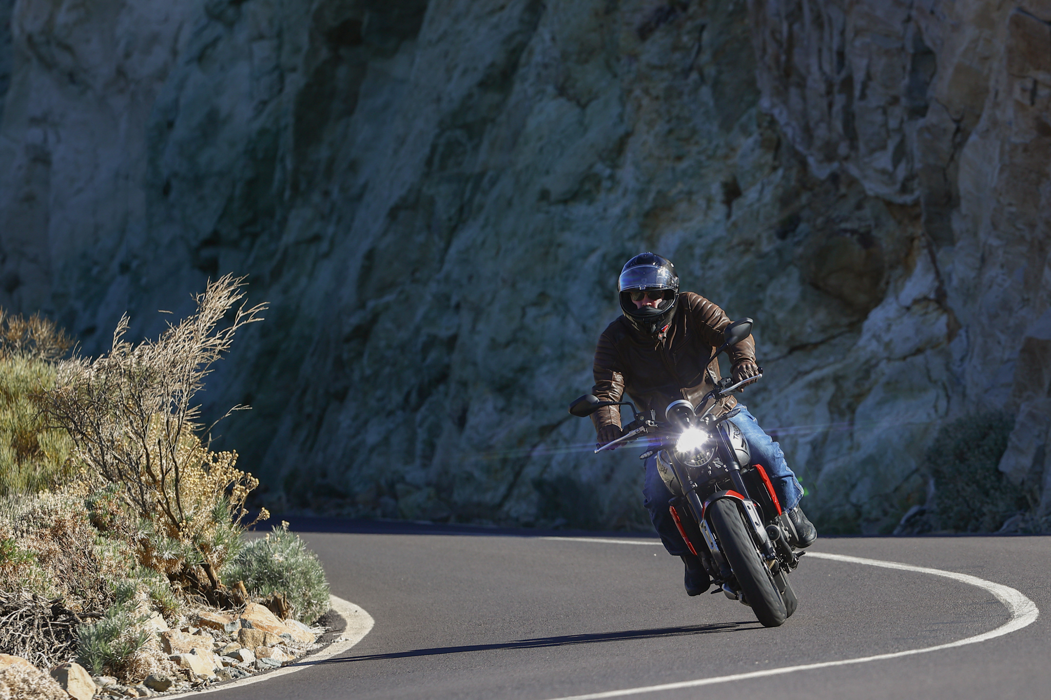 Sur les petits lacets sinueux qui mènent du village d’Arona à La Escalona, au bitume impeccable quoiqu’un peu humide, la Trident se laisse mener avec facilité. Les pneumatiques, des Michelin Pilot Road 5 en première monte, font merveille ici, et sont à même d’être rassurants en toute circonstance.
