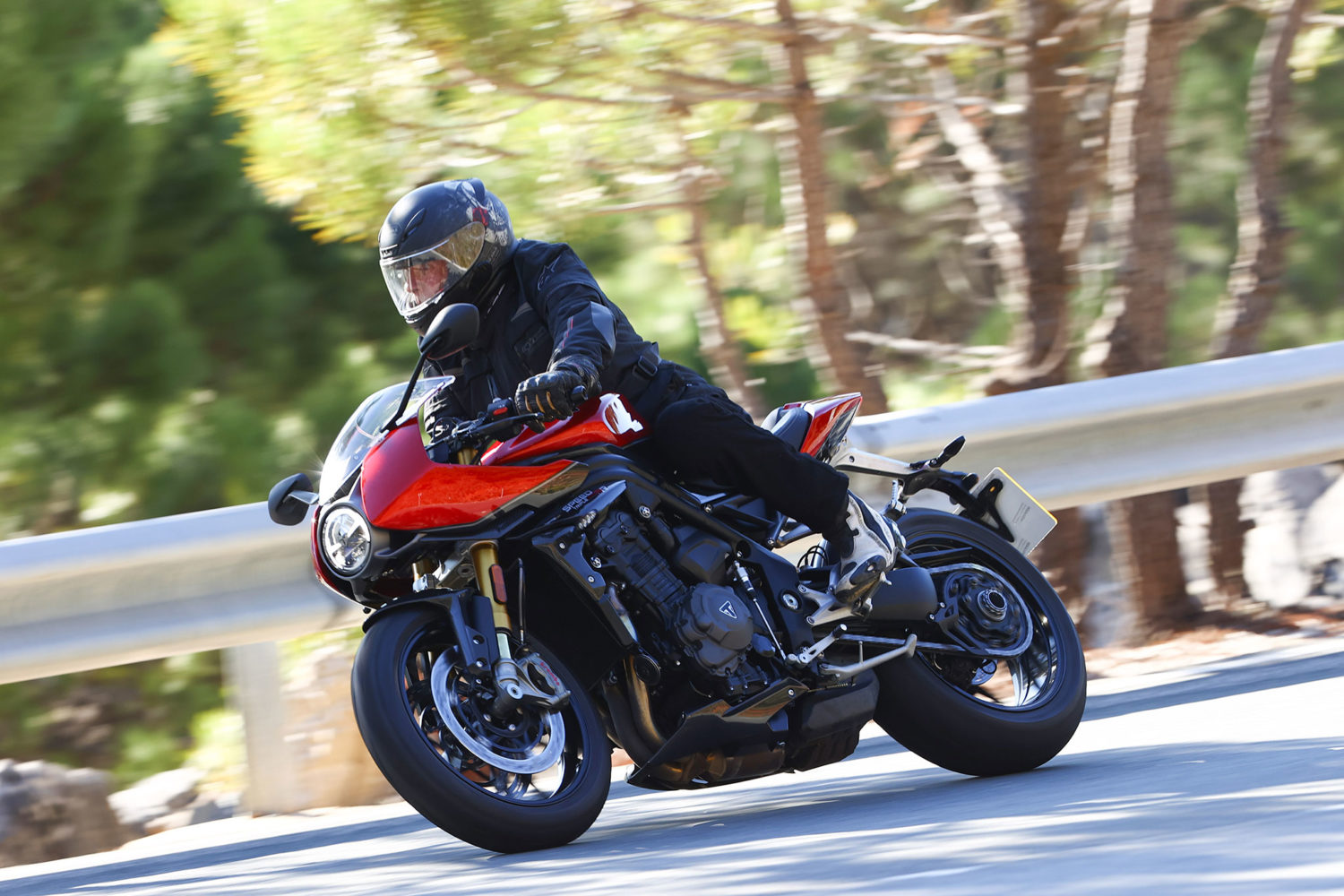 On est lancé sur cette fameuse route, la position de conduite permet d’attaquer un peu et elle permet aussi de vérifier la précision extrême d’entrée en courbes octroyée par le châssis réactif de la Speed Triple 1200 RR. Le freinage « Stylema » prévient et contrôle les éventuelles erreurs de jugement, car avec ses 180 chevaux déchaînés, la RR est véritablement une sportive adaptée à la route.