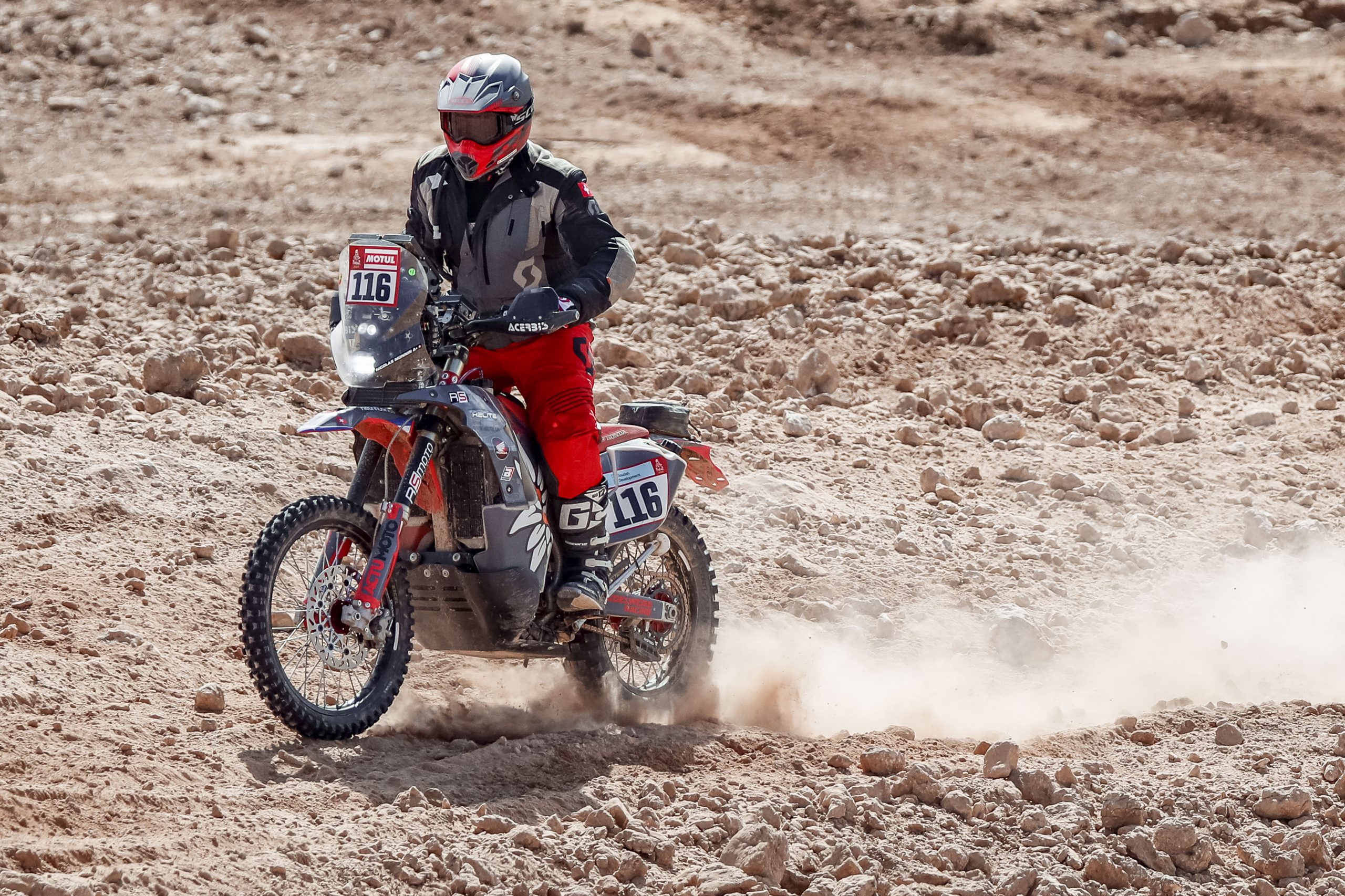 J’ai eu une chute dans la 5ème étape. J’avais un peu d’angle sur des grosses pierres roulantes, j’ai mis trop de gaz et la moto est partie. Mais en retombant, elle a tapé assez fort, ça a abîmé le sabot mais ça a surtout cassé le raccord d’essence qui était placé derrière. J’ai dû m’arrêter pour le changer, car je perdais tout mon carburant. Heureusement, j’avais un raccord de réserve sur moi.