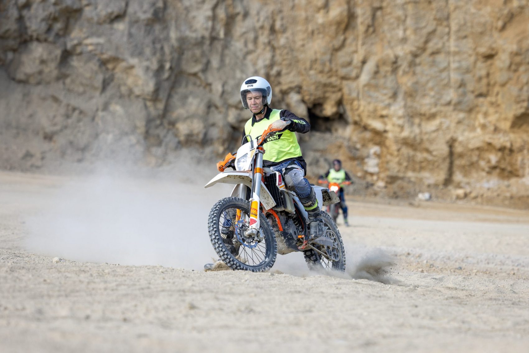 Pendant ce temps, le groupe avec les motos d’enduro explore le reste de la carrière, en empruntant le maximum de terrains différents. L’instructeur ouvre la voie, en montrant la position à adopter sur la moto dans chaque situation. Cet exercice permet à chacun de prendre ses marques avec les motos.