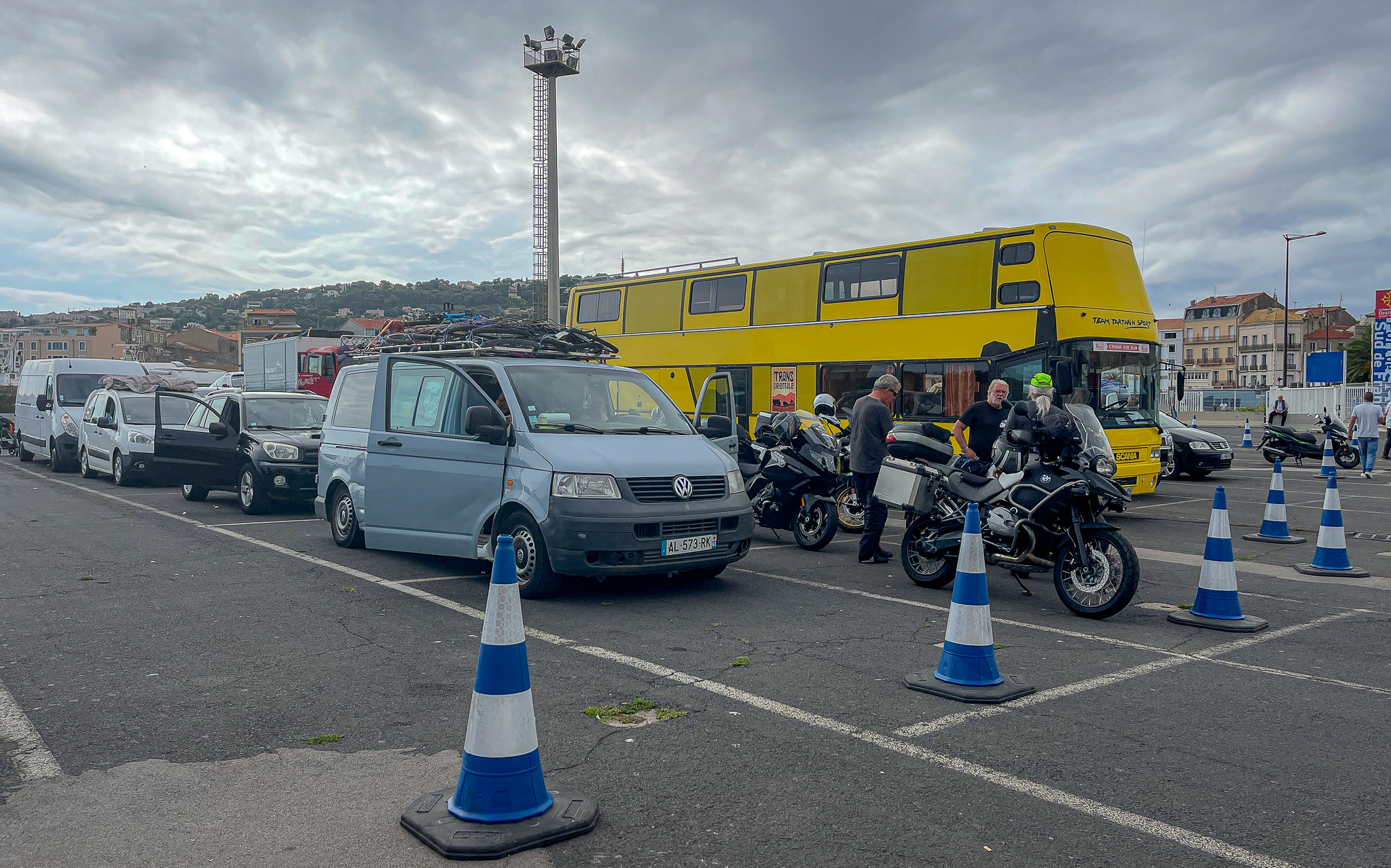 Après plusieurs heures d’attente entre béhèmistes (toutes les motos sont bavaroises, et je suis le seul à ne pas rouler en GS), les barrières s’ouvrent enfin. Il est temps de s’élancer en direction du bateau, non sans avoir quelques postes de contrôle à passer. Police, douane, contrôle des billets, me voilà roulant sur le quai, seul en direction de l’imposante masse métallique qui doit me transporter sur un autre continent. Elle semble m’attendre, gueule grande ouverte, prête à engloutir une K1600GT qui parait bien frêle en comparaison. Mais mon élan est coupé net : il faut – encore – patienter avant de pouvoir embarquer.