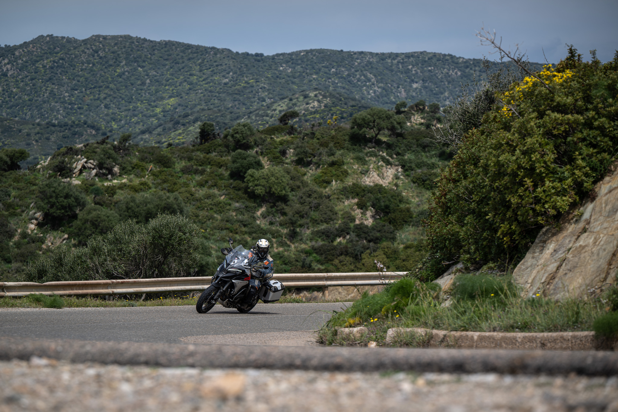 Malgré sa plus grande taille, son centre de gravité plus haut que la Multistrada V4S, la Rally ne se pilote pas différemment. Le premier bout de notre essai se déroule tout au long d’une route côtière au paysage à couper le souffle. Mais il faut rester concentré sur le prochain virage, car le rythme de ce test s’annonce rapide, et les enchaînements sont par endroits particulièrement serrés. Heureusement, le bitume est de bonne qualité, et il y a bien assez de place pour rester de son côté de la route.