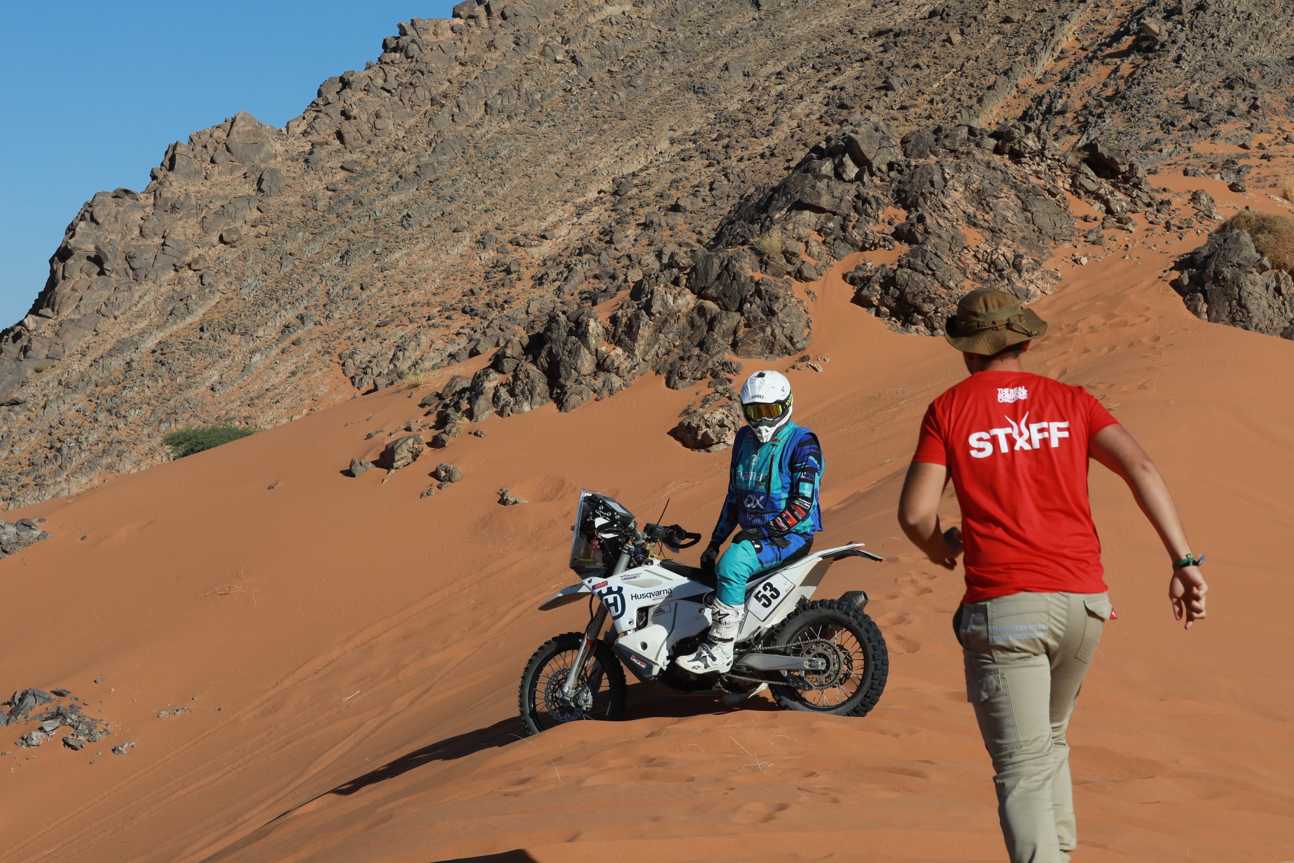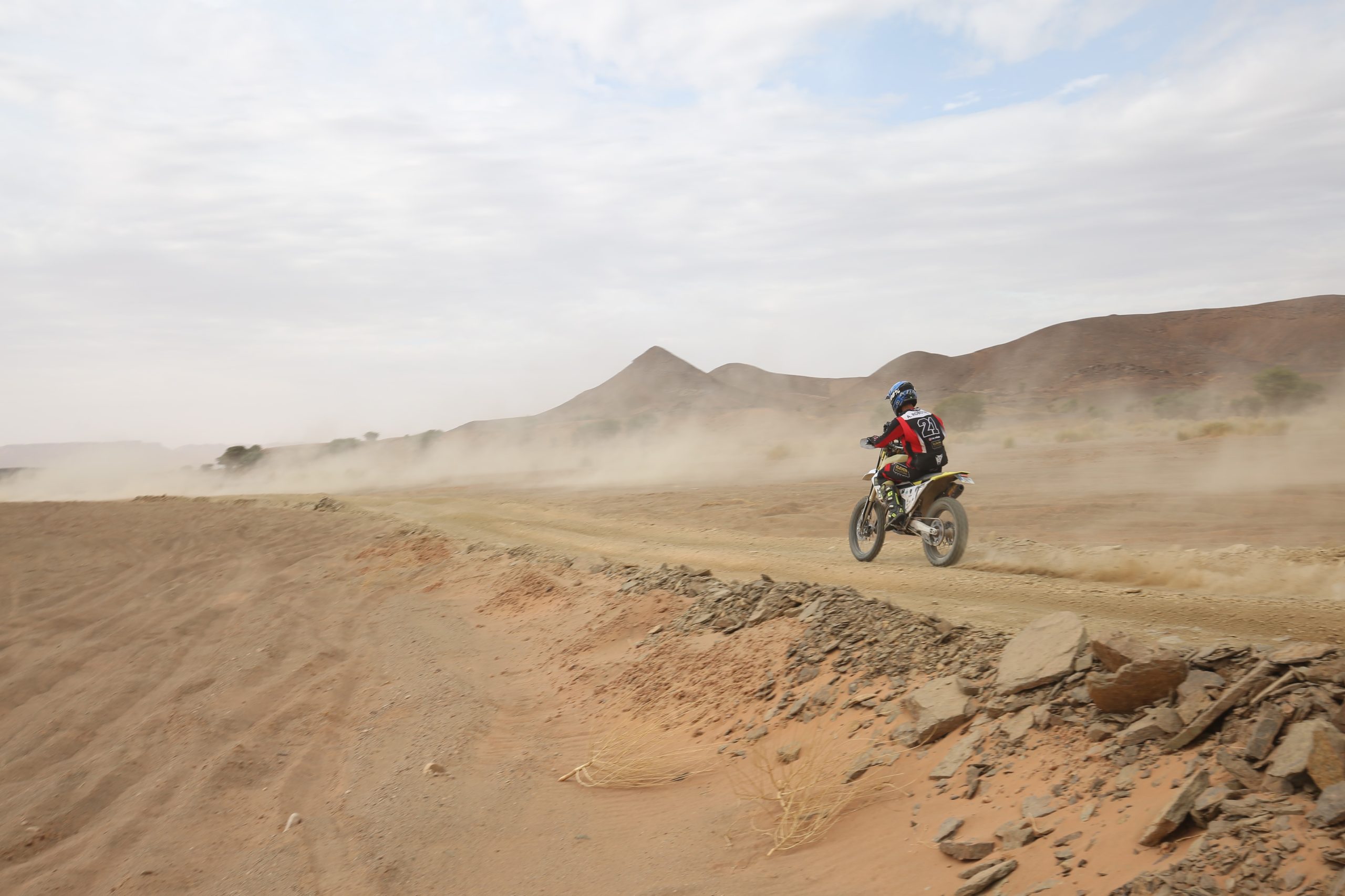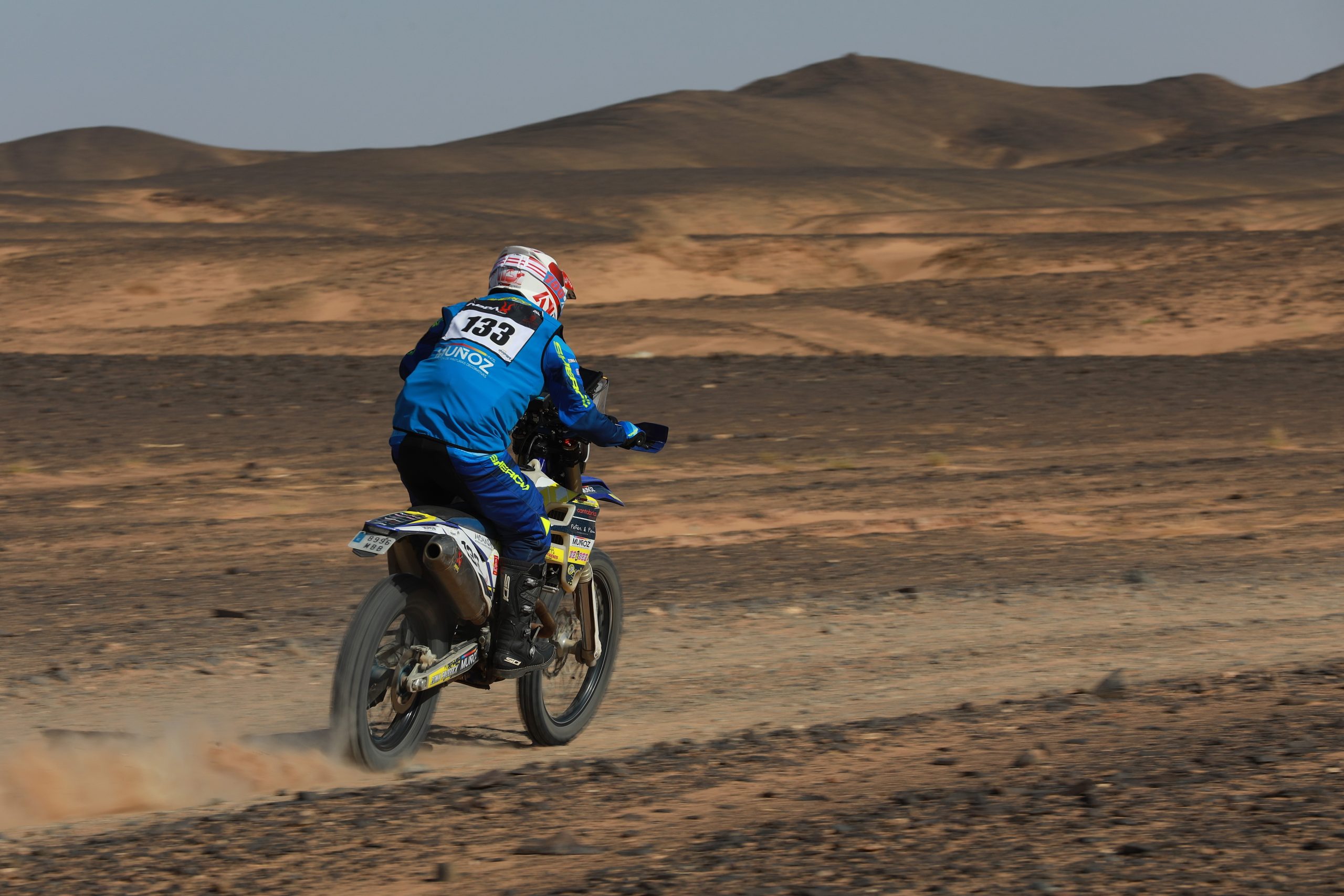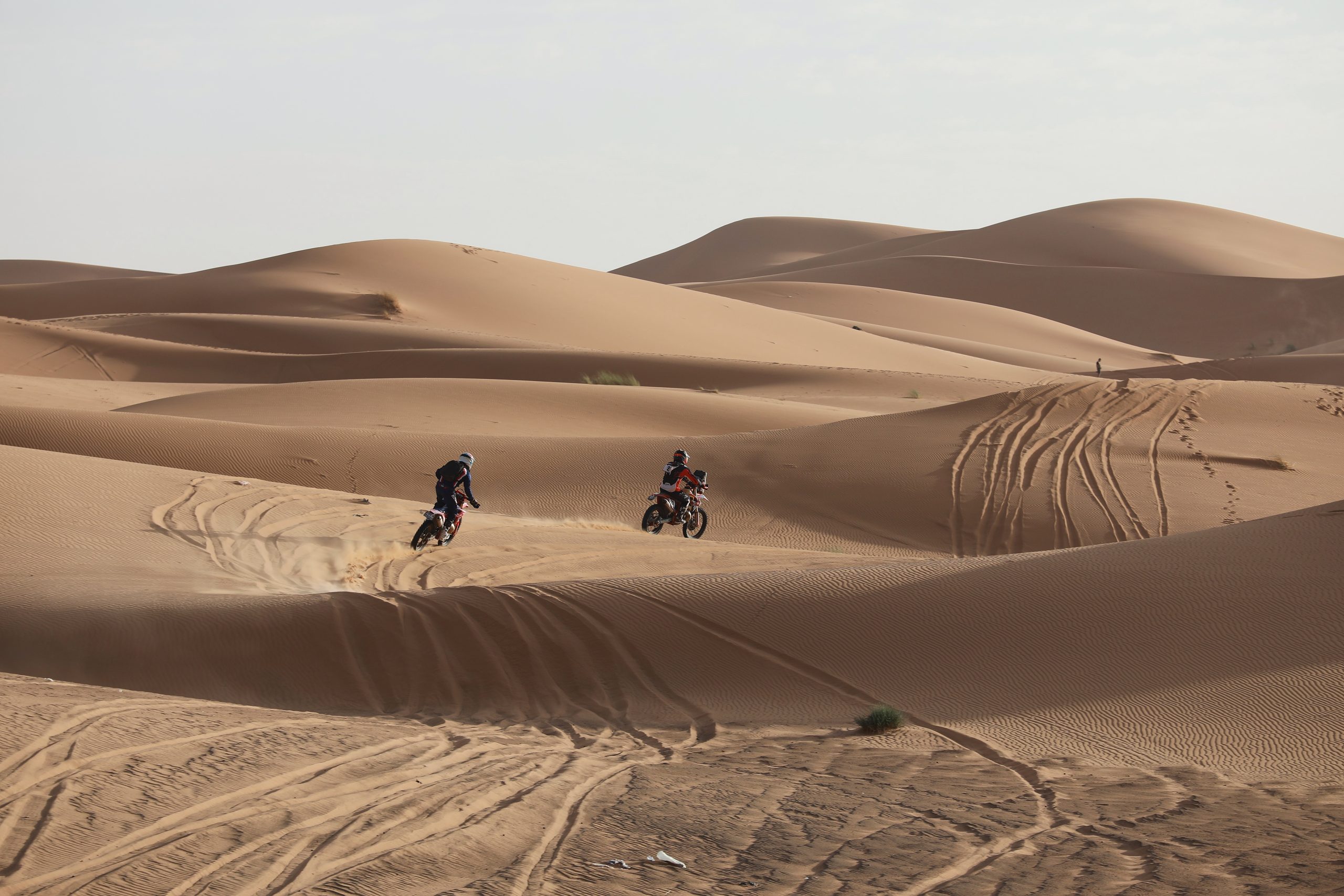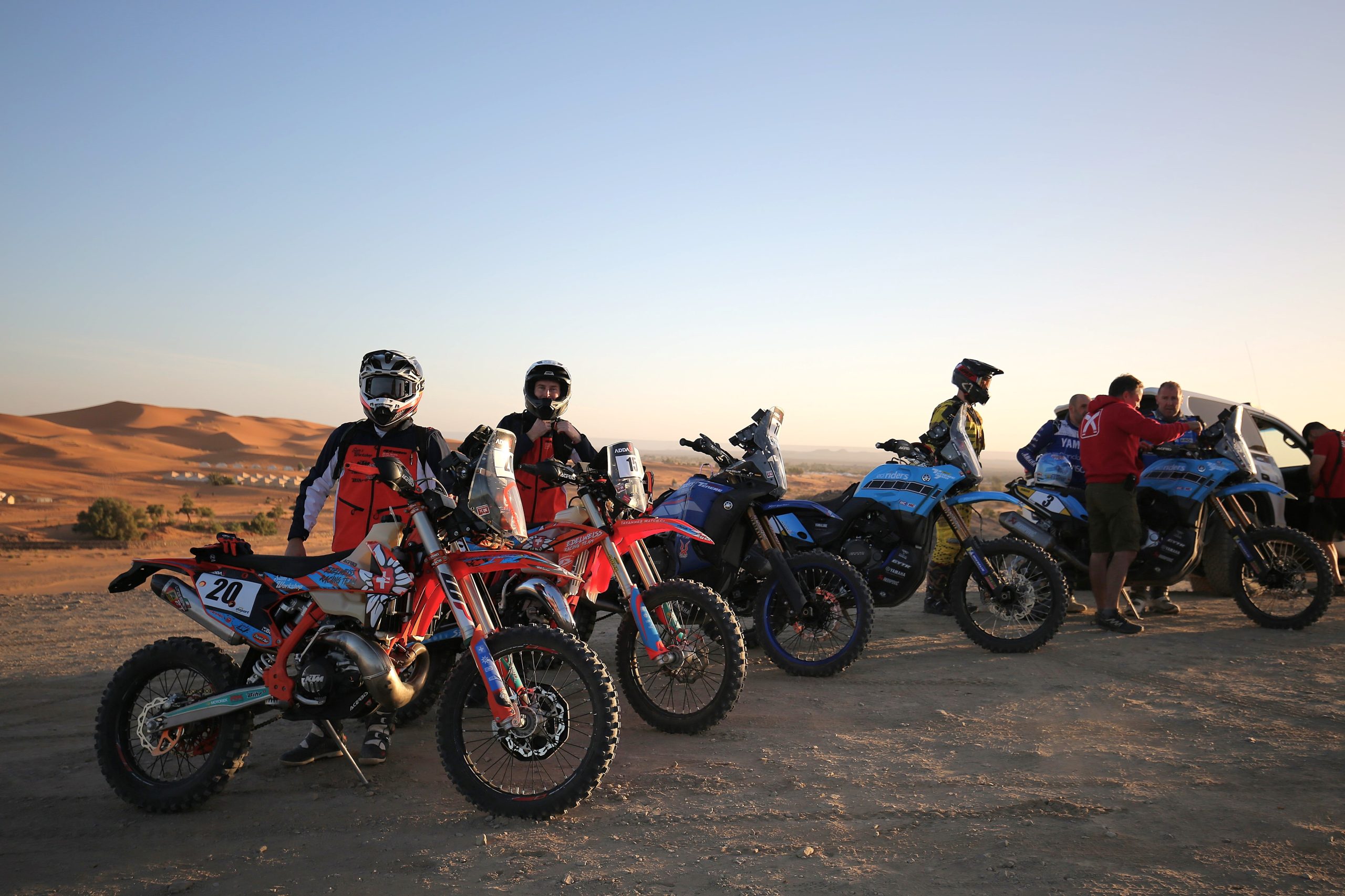 J’ai été un membre à part entière de l’équipe, du briefing dès nos premiers pas sur le sol marocain au débriefing le dernier soir sur fond de soleil couchant sur les dunes. J’ai vu les séances de mécanique, de nettoyage, de préparatifs de jerrycans d’essence pour les ravitaillements du lendemain, les rigolades, l’inspection et le nettoyage des motos après chaque spéciale et l’inlassable maîtrise du corps de balai du team pour enlever l’envahissante présence de la poussière et du sable.