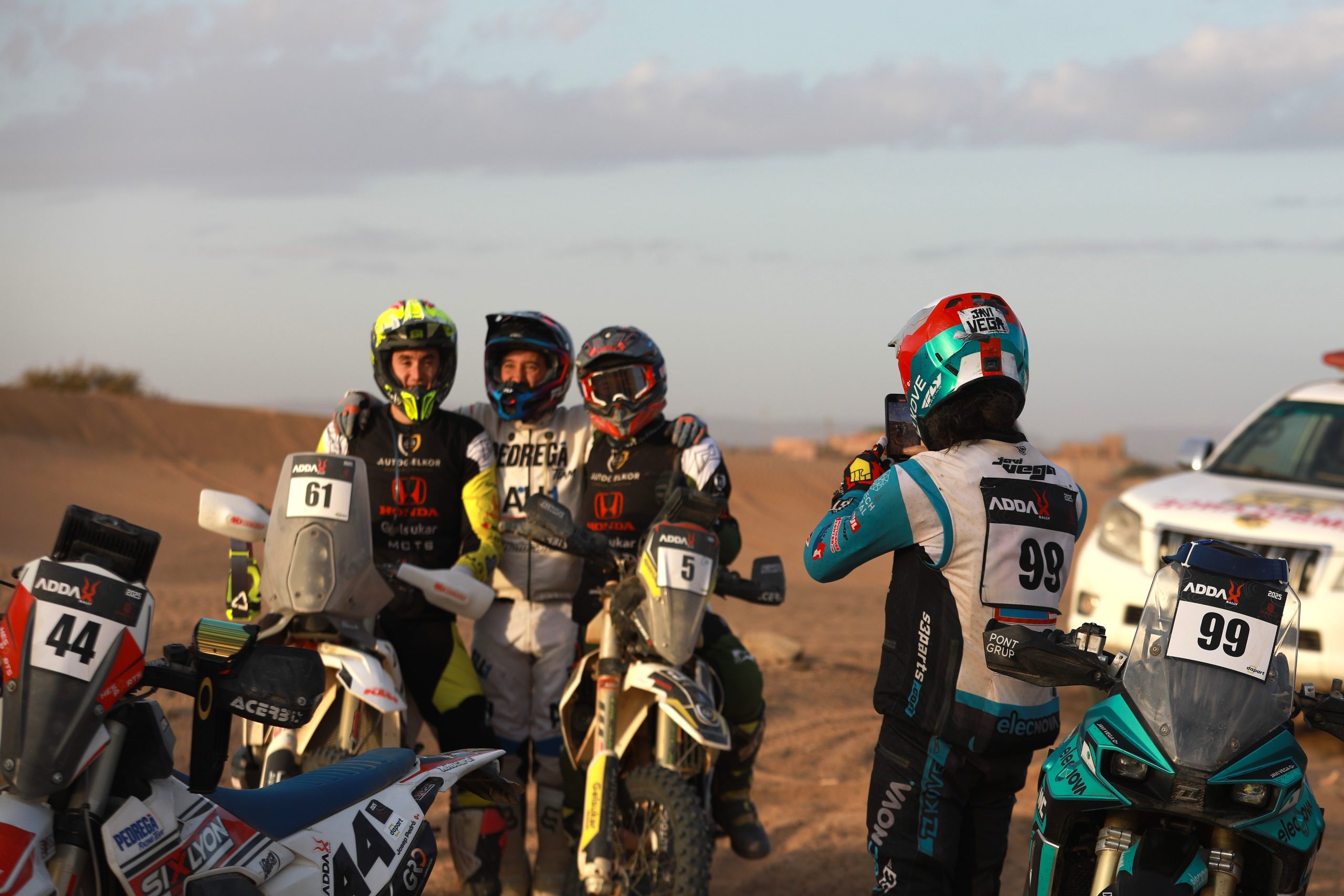 Lors de ce rallye Addax, les pilotes sont généralement très accessibles, concentrés et souriants. Mais le plus cool de tous a été assurément Javi Vega, que je ne connaissais pas avant d’arriver à Merzouga. Ni même les autres cadors. Ni même le rallye-raid en général.
