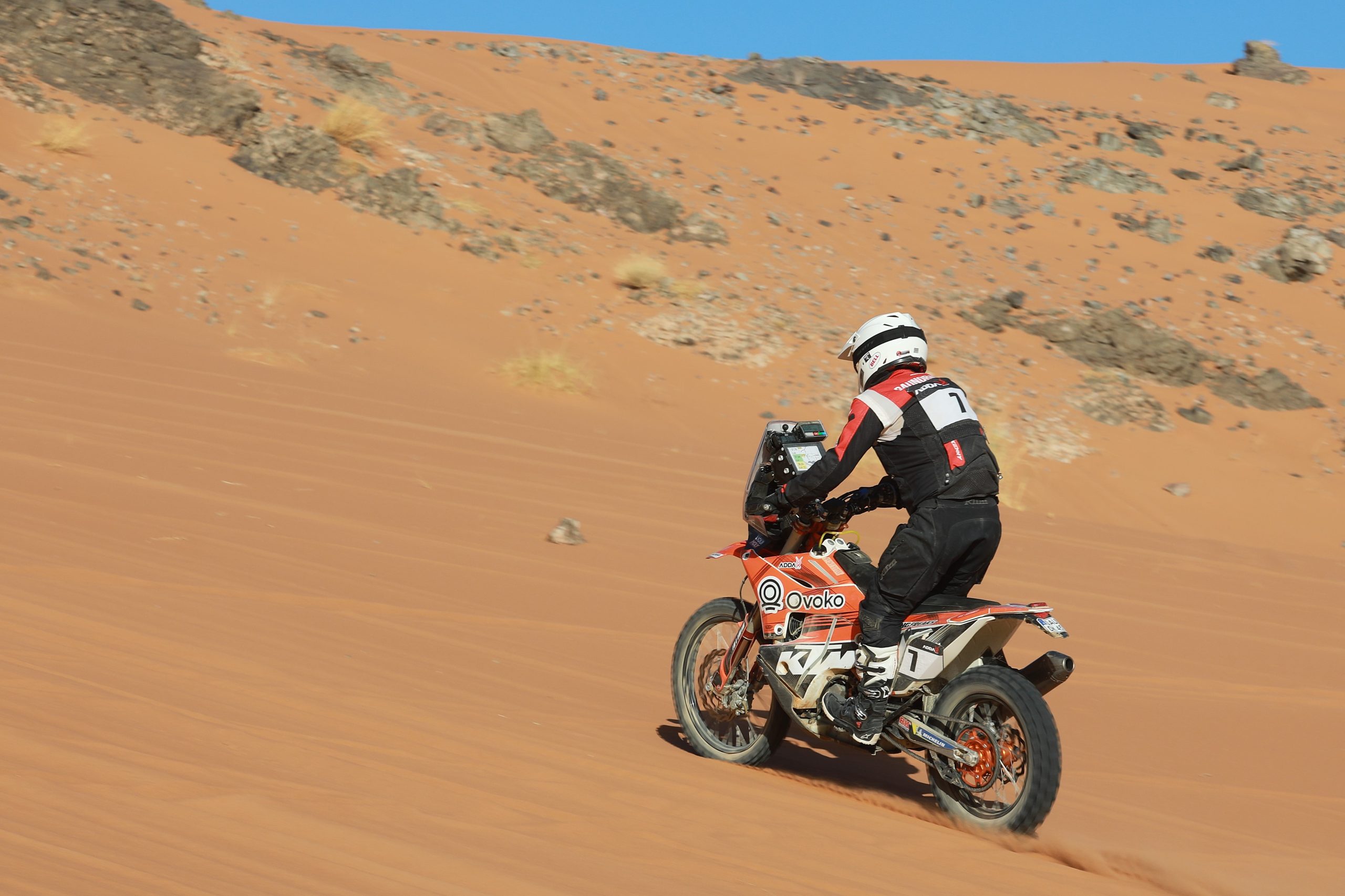 Les pilotes vont naviguer dans les paysages sublimes (pas sûr qu’ils aient eu vraiment le temps de les contempler !), avec une navigation extrêmement difficile. Bref, une étape jugée physique avec 50% d’un tracé de 430 kilomètres qui va serpenter dans les dunes.