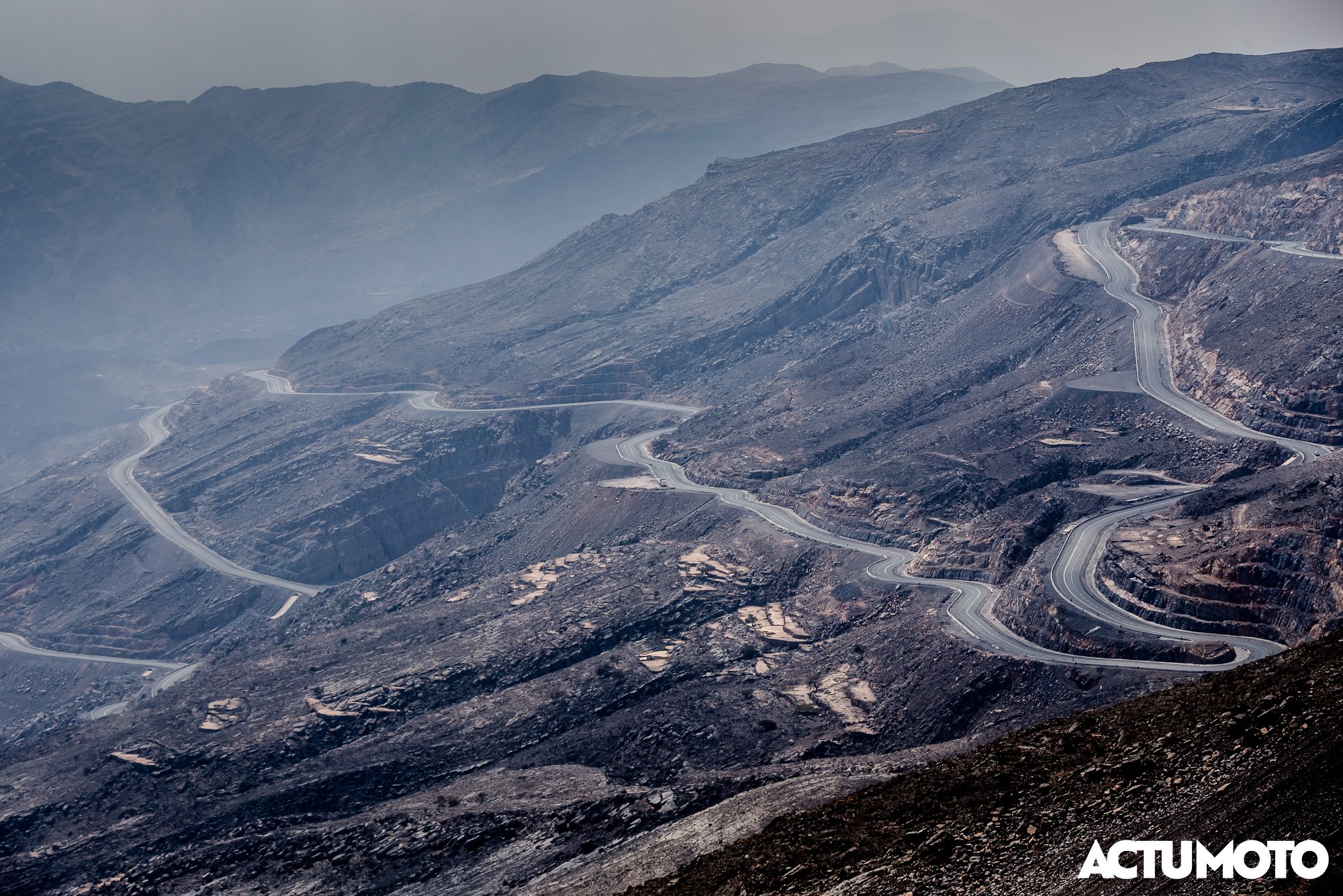 Bienvenue aux Émirats Arabes Unis, avec cette petite route qui serpente sur le mont Jebel Jais, depuis la ville de Khas Al Khaimah, en direction du sultanat d’Oman.